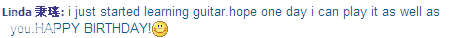 Linda: I just started learning guitar. Hope one day I can play it as well as you. HAPPY BIRTHDAY! =D