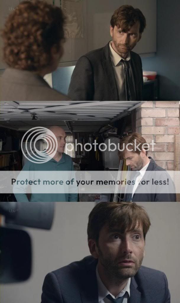 噢噢噢幸好狗還活著,然後Alec送醫這件事 Ellie Miller 覺得很生氣,對啊有個負重病的人還堅持工作!!!但Alec還是回到警局,但是他只有一天的時間,因為隔天警方醫院那邊會把Alec帶走。這集有兩個大爆點,Susan 的小孩居然是那個光頭、Alec Hardy 背負的譴責 (以前那樁案子破不了) 原來是他老婆送證物時,先去旅館小酌,還外遇,後來車子被打劫,最重要的證物消失,Alec為了不讓女兒發現媽媽有外遇,所以把這整個事件給扛了下來,也因為這樣,自己也生了病。 Q __ Q