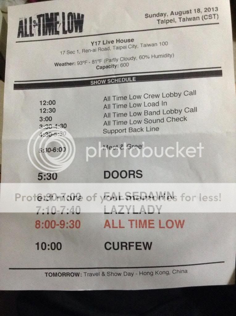 All Time Low has a gig/concert in Taipei Taiwan on 18.08.2013 低迷樂團(這翻譯真的很不喜歡[炸])在8月18號禮拜天晚上在台北開演唱會。謝謝台灣的工作人員、單位,及ATL、ATL的crew,讓我們有印象深刻的經驗。